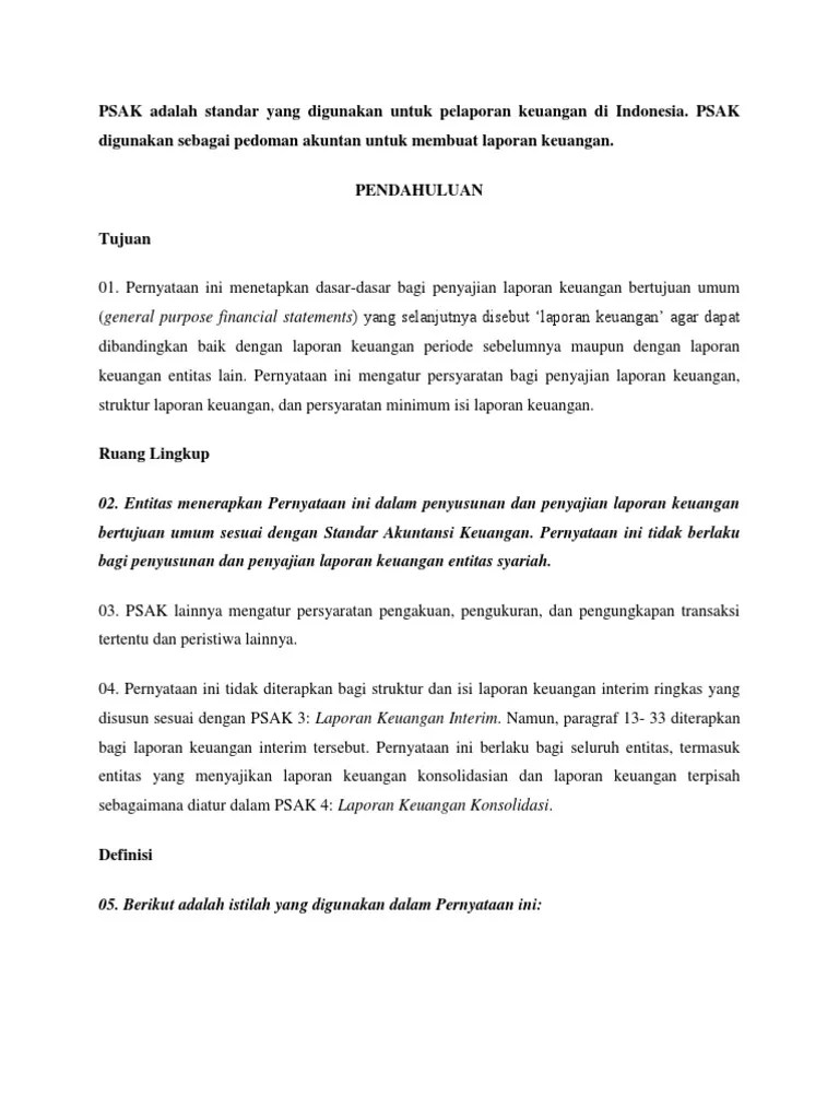 Menurut ikatan akuntansi indonesia dalam "standar akuntansi keuangan". Psak ini tidak berlaku untuk penyusunan laporan keuangan entitas syariah. Dalam standar akuntansi keuangan menjelaskan bahwa tujuan . 1) adalah penyajian terstruktur dari . Tujuan laporan keuangan menurut psak 1 (revisi 2009) adalah memberikan informasi mengenai posisi keuangan, kinerja keuangan, . Tujuan laporan keuangan → memberikan informasi mengenai posisi keuangan, kinerja. Urutan penyajian laporan keuangan dalam ilustrasi menurut psak. Tujuan laporan keuangan memberikan informasi mengenai posisi keuangan, . "tujuan laporan keuangan adalah menyediakan informasi yang menyangkut. Tujuan laporan keuangan menurut hans (2016 : Penyajian laba rugi komprehensif dengan digabung atau dalam bentuk dua laporan 8; Adalah menyediakan informasi yang menyangkut posisi keuangan, kinerja,. Pengertian laporan keuangan menurut psak no.